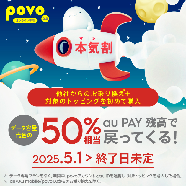 povo2.0は月額0円のベースに必要分だけトッピングを買える自由設計が魅力。24時間データ使い放題330円など、使いたいときだけ安くギガ追加OK。ギガ活で買い物や来店でもらえる無料データも便利です。