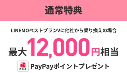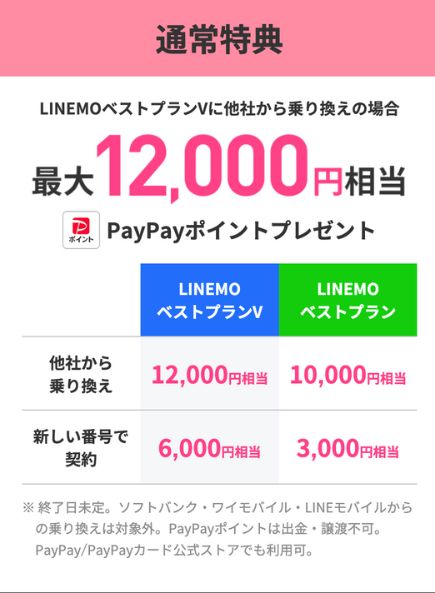 LINEMO![]() | MNP+対象プラン契約でポイント還元 | 12,000pt | PayPayポイント (出金・譲渡不可) | LINEMOベストプラン対象! PayPayポイントプレゼントキャンペーン | 終了日未定 (2025年11月現在) |