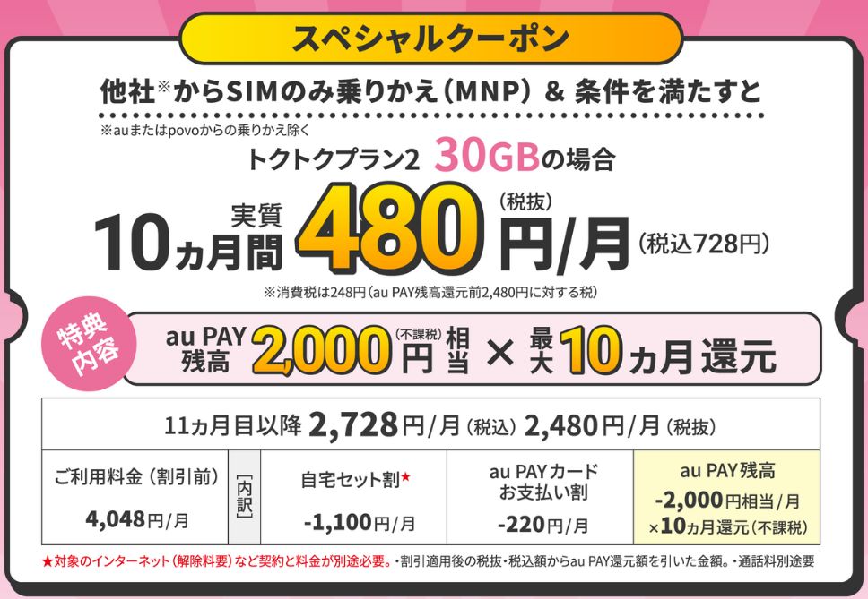 UQモバイル![]() | MNP+対象プラン契約でau PAY残高還元 | 20,000円相当 | auPAY残高 | スペシャルクーポン | 終了日未定 (2025年11月現在) |