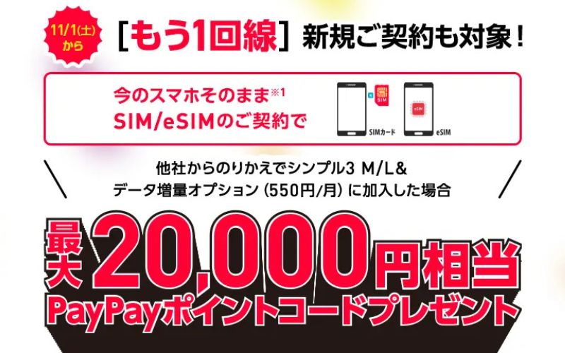 ワイモバイル![]() | MNP+対象プラン契約でポイント還元 | 20,000pt | PayPayポイント (出金・譲渡不可) | ワイモバ SIM契約キャンペーン | 終了日未定 (2025年11月現在) |