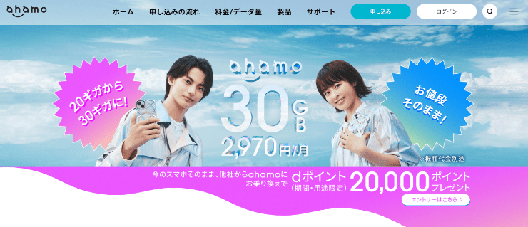 ahamoはドコモ回線を使った高品質な通信が魅力。30GBの大容量データに5分以内の国内通話が無料でついて月額2,970円。海外82の国・地域でも追加料金なしで利用可能な点が特徴です。