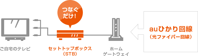 auひかり テレビサービスをご覧いただくのに必要なセットトップボックスとテレビをつなぐだけで高画質・高音質の多彩なチャンネルやビデオがお楽しみいただけます。